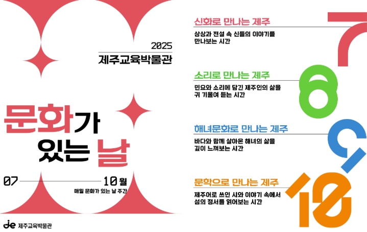 7월에는 ‘신화로 만나는 제주’를 시작으로 8월에는 ‘소리로 만나는 제주’, 9월에는 ‘해녀문화로 만나는 제주’, 10월에는 ‘문학으로 만나는 제주’를 주제로 프로그램이 운영된다.