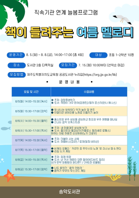 [뉴스노크=김인호 기자] 제주도교육청 송악도서관은 8월 5일부터 14일까지 도서관의 공간과 자원을 활용하여 학생들에게 안전하고 유익한 돌봄 환경을 제공하고 학습과 정서적 성장을 지원하기 위한 ‘책이 들려주는 여름 멜로디’ 늘봄 프로그램을 운영한다.