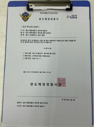 완도해경에 따르면 지난 9일, 광주광역시 소재 한 업체가 ‘완도해경 흡연부스 철거 계획’과 관련된 공문을 수신했다.