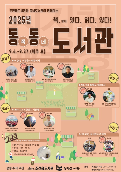 행사는 조천읍도서관(9월 6일, 9월 20일)과 동녘도서관(9월 13일, 9월 27일)에서 총 4회에 걸쳐 작가 초청 강연, 공연, 체험 프로그램, 전시, 이벤트 등이 진행된다.