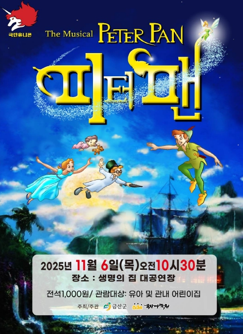 [뉴스노크=김인호 기자] 금산군은 지역 내 아이들에게 수준 높은 문화예술을 전하기 위해 어린이 뮤지컬 ‘플라잉 피터팬’을 11월 6일 오전 10시 30분 금산다락원 생명의 집 대공연장에서 공개한다.