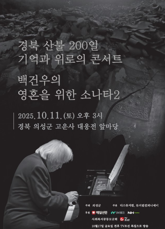 김주수 의성군수는 “이번 공연은 대형산불로 큰 피해를 입은 지역 공동체의 상처를 음악으로 어루만지고자 마련된 자리”라며, “백건우 선생의 피아노 선율을 통해 군민 모두가 희망과 치유의 시간을 함께하길 바란다”고 말했다.