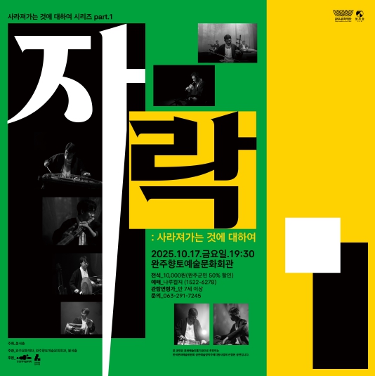 [뉴스노크=김인호 기자] 전북 완주군에 깊어가는 가을밤, 사라져가는 토속 민요의 숨결을 현대적인 감각으로 재조명하고 재해석한 특별한 국악 공연이 펼쳐진다. 완주문화재단은 오는 10월 17일, 완주향토예술문화회관에서 국악앙상블 불세출의 '자락: 사라져가는 것에 대하여' 공연을 개최한다