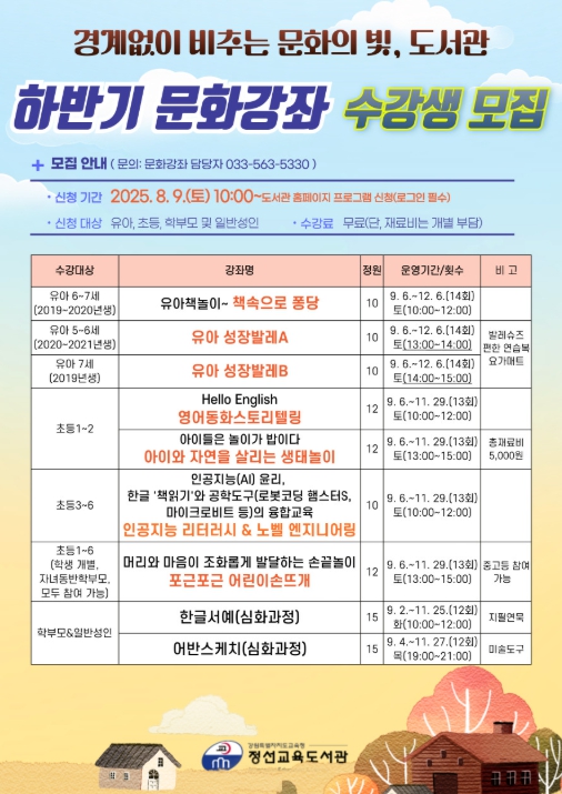 수강 신청은 8월 9일부터 정선교육도서관 누리집을 통해 선착순으로 접수하며, 모집 마감 시까지 신청 가능하다.