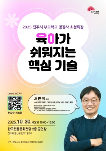 이번 특강은 유아 및 초등학생 자녀를 둔 학부모 200명을 대상으로 무료로 진행되며, 참여를 원하는 학부모는 전주시 누리집 및 네이버폼(QR코드)을 통해 선착순 신청하면 된다.