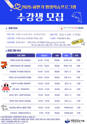 수강생 모집 기간은 8월 6일부터 8월 20일까지이며, 화천교육도서관 누리집을 통해 선착순 접수한다.