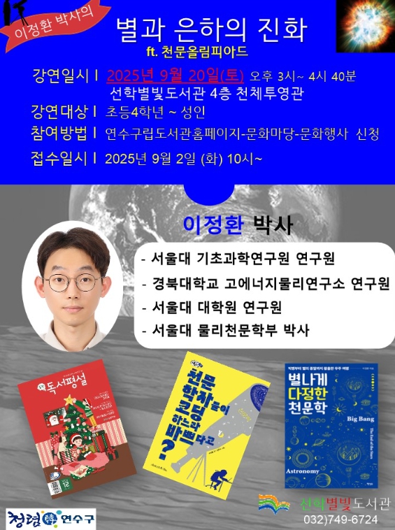 도서관 관계자는 “이번 강연은 허블과 제임스웹 우주망원경이 촬영한 경이로운 천체 사진과 함께 별과 은하의 진화과정을 생생하게 전달할 것으로 기대한다.”라며 “우주에 대한 호기심을 자극하고, 천문학자를 꿈꾸는 학생들에게 진로 소개의 기회도 제공될 예정이다.”라고 덧붙였다.