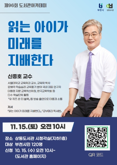 [뉴스노크=김인호 기자] 부천시는 11월 15일 오전 10시 부천시립상동도서관 시청각실에서 인공지능(AI)·디지털 시대 학습 경쟁력의 핵심인 문해력을 주제로 ‘제96회 도서관 아카데미’를 연다. 이번 강연은 ‘읽는 아이가 미래를 지배한다’의 저자이자 서울대학교 교육학과 교수인 신종호 교수를 초청해 진행한다.