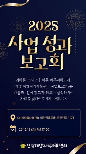 [뉴스노크=김인호 기자] 인천계양지역자활센터(센터장 한경주)는 2025년 한 해 동안 추진한 자활사업의 성과를 공유하고 참여주민을 격려하기 위해 ‘2025년 사업성과 보고회’를 오는 12월 12일 오후 5시 CN웨딩홀 계산점에서 개최한다고 밝혔다.