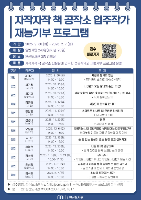 박남미 전주시 도서관평생학습본부장은 “이번 프로그램은 전문작가들이 시민과 직접 만나 지식과 경험을 나누는 뜻깊은 자리”라며 “많은 시민이 참여해 글 쓰는 창작의 기쁨을 함께 나누길 바란다”고 말했다.
