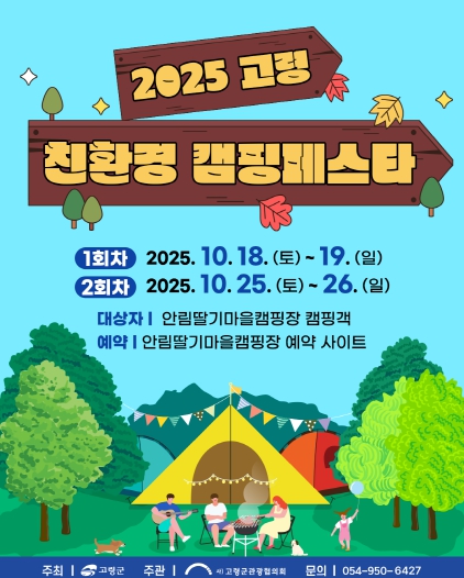 [뉴스노크=김인호 기자] 지역과 미래를 배려하는 친환경 캠핑 문화 확산을 위해 마련된 ‘2025 고령 캠핑 페스타’가 오는 10월 18일부터 19일, 10월 25일부터 26일 두 차례에 걸쳐 안림딸기마을캠핑장에서 열린다.