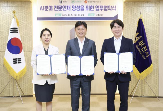 [뉴스노크=김인호 기자] 부천시는 지난 4일 부천시청 만남실에서 유한대학교, 한국만화영상진흥원과 함께 ‘인공지능(AI) 분야 첨단산업 인재 양성을 위한 만화‧영상 부트캠프 운영’ 업무협약을 체결했다고 5일 밝혔다.
