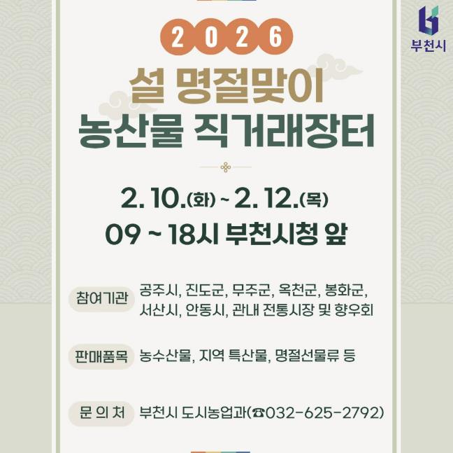[뉴스노크=김인호 기자] 부천시는 설 명절을 앞두고 2월 10일부터 12일까지 시청 정문 앞에서 ‘2026년 설 명절맞이 농산물 직거래장터’를 연다.