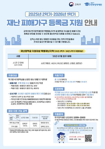 재난장학금은 특별재난지역 선포일 기준 다음 학기부터 1년간 2학기 연속으로 지급되며, 지원 대상은 2025년 2학기 국가장학금을 신청한 학생 중 피해 가구원에 해당하는 대학생이다. 가구의 피해 정도와 학생의 소득 구간에 따라 등록금이 최대 전액까지 지원된다.
