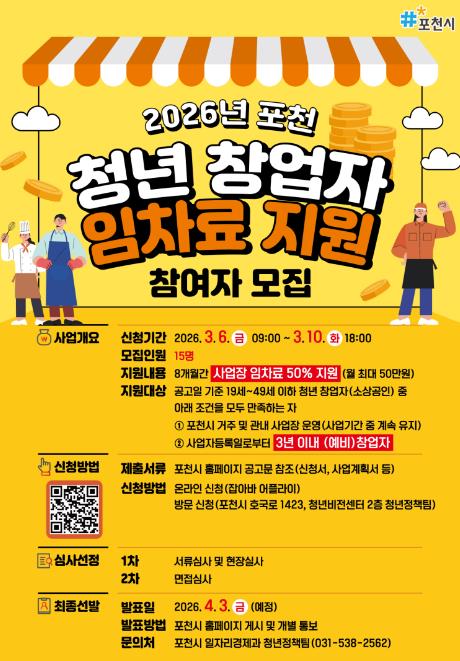 포천시 관계자는 “청년 창업자들이 초기 경영 부담을 덜고 안정적으로 성장할 수 있도록 실질적인 지원을 이어가겠다”며 “창의적인 아이디어와 열정을 갖춘 청년 창업자들의 많은 관심과 참여를 바란다”고 말했다.