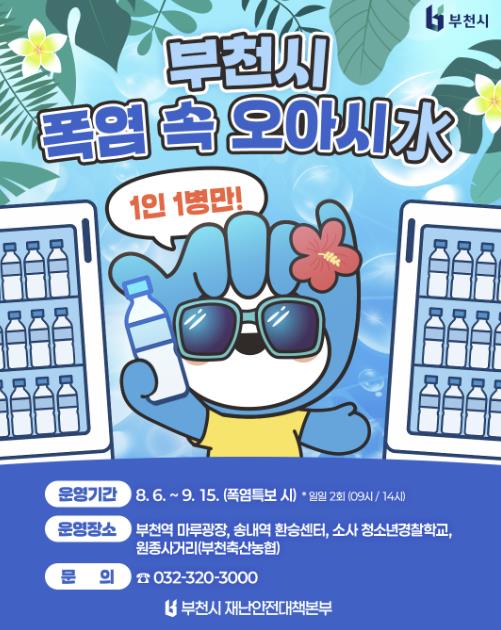 아울러 시는 언론보도, 부천알림톡, 재난문자, 교통홍보전광판 등 다양한 매체를 활용해 ‘폭염 속 오아시수(水)’를 적극적으로 홍보하고, 더 많은 시민이 혜택을 받을 수 있도록 할 예정이다.