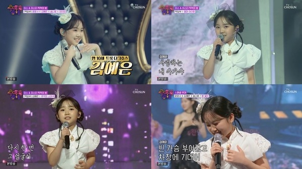 이날 김예은은 윤윤서, 송나윤, 최이정과 함께 ‘떡잎부’ 팀을 이뤄 송가인의 ‘엄마아리랑’으로 합동 무대를 꾸렸다. 맛깔나는 어깨춤으로 시선을 사로잡은 김예은은 만 10세 나이가 믿기지 않는 깊이 있는 가창력과 당찬 무대 매너로 감탄을 자아냈다.