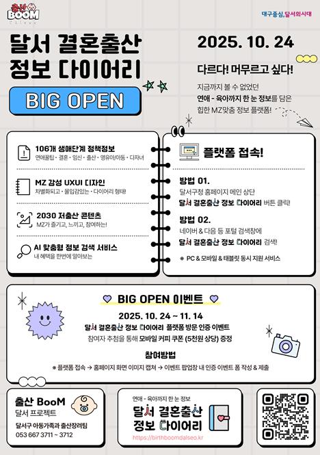 [뉴스노크=김인호 기자] 대구 달서구는 전략형 저출산 대응 프로젝트'출산BooM 달서'의 일환으로 연애부터 육아까지 생애주기별 정책 정보를 한눈에 담은 통합정보 플랫폼'달서 결혼출산 정보 다이어리'를 정식 오픈했다고 28일 밝혔다.