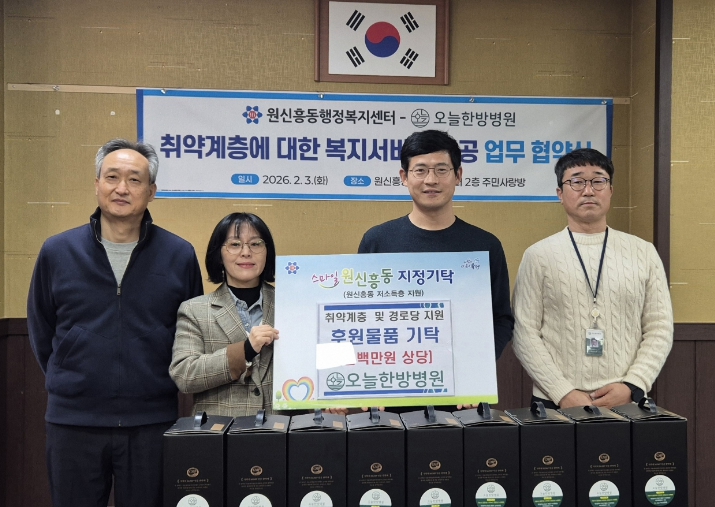 협약식 이후에는 오늘한방병원이 100만 원 상당의 건강 음료를 후원했으며, 후원된 물품은 관내 임대아파트가 위치한 경로당 3곳에 우선 전달될 예정이다.