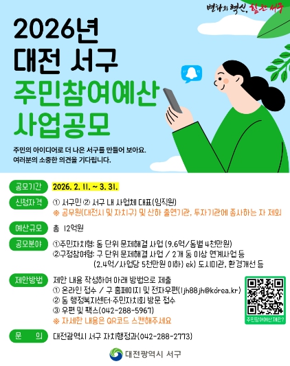 [뉴스노크=김인호 기자] 대전 서구는 이달 11일부터 다음 달 31일까지 주민참여예산 공모사업에 관한 주민들의 제안을 받는다.