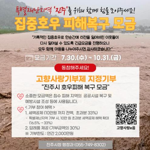 시는 집중호우로 피해를 입은 지역 복구를 위한 ‘진주시 집중호우 피해복구 모금’ 고향사랑기부제 지정기부사업을 지난 7월 30일부터 긴급 추진 중이다.