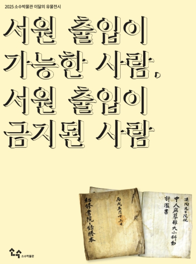 [뉴스노크=김인호 기자] 영주시 소수박물관은 12월 1일부터 2026년 2월 22일까지 이달의 유물전시 ‘서원 출입이 가능한 사람, 서원 출입이 금지된 사람’을 개최한다.