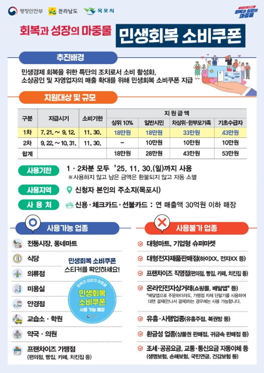 [뉴스노크=김인호 기자] 목포시가 민생회복 소비쿠폰 1차 지급을 오는 21일부터 시작한다.
