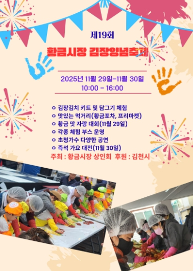 [뉴스노크=김인호 기자] 김천시에서는 오는 29일~30일 황금동 한신로 일원에서 ‘제19회 황금시장 김장양념축제’를 개최한다고 밝혔다.