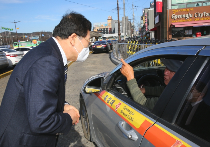 | ▲ 주낙영 경주시장이 택시 운수종사자와 만나 현장 의견을 청취하고 있다. |
