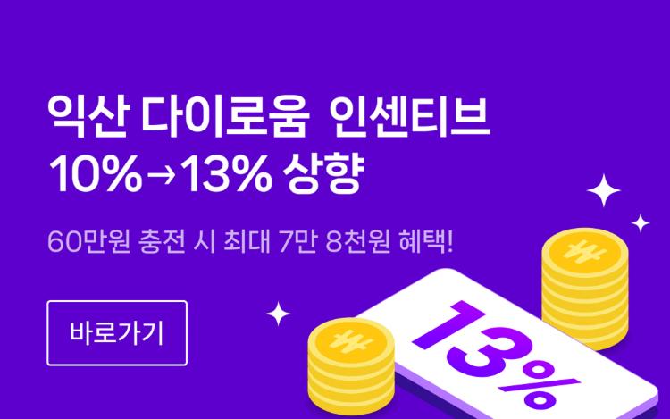 익산시는 9월부터 12월까지 '다이로움'의 충전 혜택을 기존 10%에서 13%로 상향한다고 29일 밝혔다.