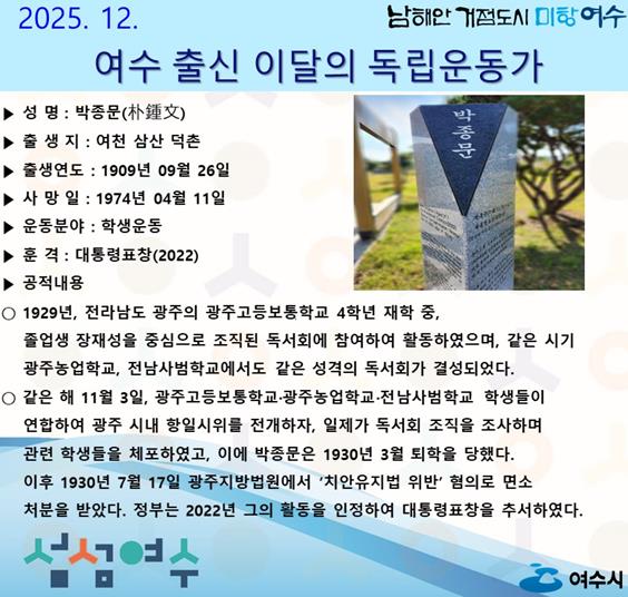 | ▲ ‘2025년 12월 여수 출신 이달의 독립운동가’ |