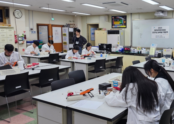 [뉴스노크=김인호 기자] 제주도교육청 제주융합과학연구원은 12일 도내 고등학교 2학년 학생 17개 팀 34명을 대상으로‘2025 제주과학창의대회(고등학교 과학탐구올림픽)’를 개최했다.