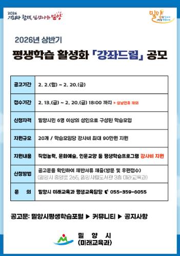 [뉴스노크=김인호 기자] 경남 밀양시는 시민이 원하는 시간과 장소에 맞춤형 평생학습 프로그램을 제공하는 2026년 상반기 평생학습 활성화 사업 ‘강좌드림’의 공모를 추진하고, 오는 13일부터 신청을 받는다고 밝혔다.