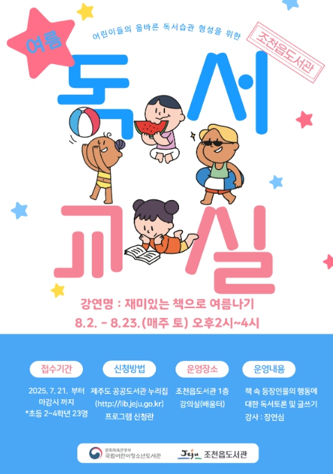 [뉴스노크=김인호 기자] 제주시 조천읍도서관은 여름방학을 맞아 초등학교 2~4학년 어린이를 대상으로 하는 프로그램 ‘여름 독서교실’ 참가자를 7월 21일부터 선착순 모집한다.