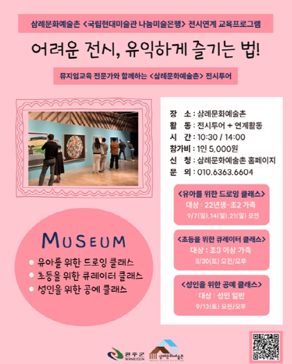 [뉴스노크=김인호 기자] 완주군 삼례문화예술촌이 ‘어려운 전시, 유익하게 즐기는 법’을 주제로 한 전시투어 프로그램을 30일부터 9월 21일까지 7회에 걸쳐 운영한다.