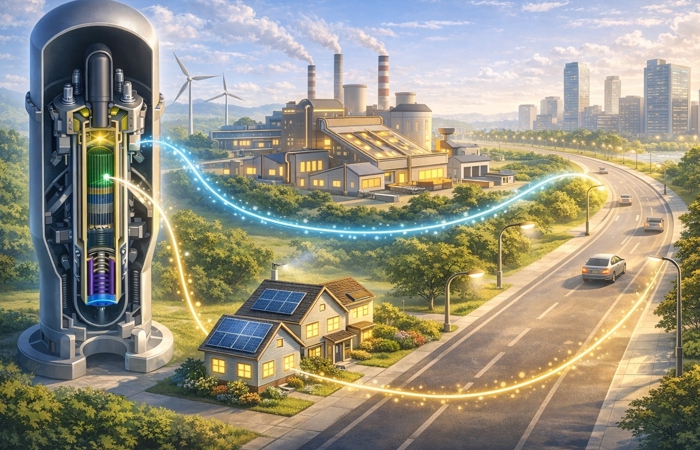 | ▲ 혁신형 소형모듈원전(i-SMR) 전력이 지역 산업시설과 생활 인프라로 확산되는 모습을 표현한 이미지 |