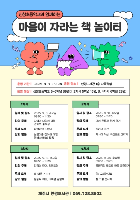 [뉴스노크=김인호 기자] 제주시 한경도서관은 신창초등학교와 함께 오는 9월 3일부터 24일까지 매주 수요일 오전 9시 50분 도서관 다목적실에서 ‘마음이 자라는 책 놀이터’ 프로그램을 운영한다.