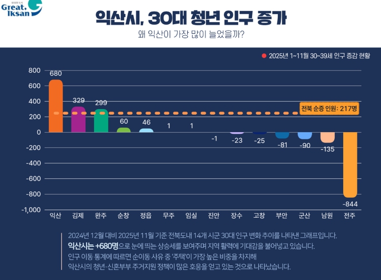 익산시는 전북 14개 시군 가운데 올해 가장 많은 30대 청년 인구 유입을 기록하며, '활력 도시'로의 전환 흐름을 실질적인 수치로 입증했다고 24일 밝혔다.