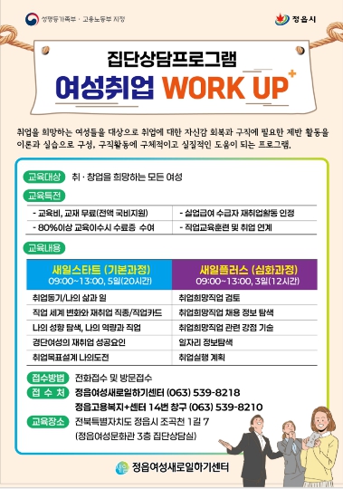 [뉴스노크=김인호 기자] 정읍여성새로일하기센터는 취업과 창업을 희망하는 여성들의 구직 역량을 강화하기 위해 ‘찾아가는 집단상담 프로그램’을 본격 운영한다. 이번 프로그램은 가족센터와 고용복지+센터 등 지역 기관과 연계해 현장 중심으로 진행된다.