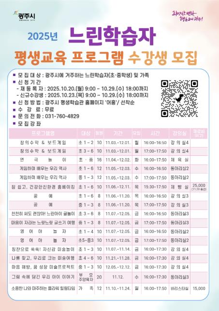 프로그램은 11월 3일부터 12월 12일까지 운영되며 총 10개 분야로 구성됐다. 수강생 모집은 10월 20일 오전 9시부터 광주시 평생학습포털 ‘어흥’에서 선착순으로 신청받는다.