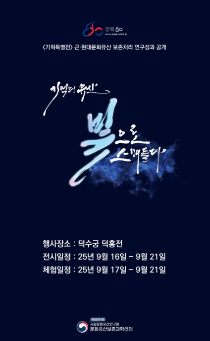 [뉴스노크=김인호 기자] 국가유산청 국립문화유산연구원 문화유산보존과학센터는 광복 80주년을 맞아 오는 9월 16일부터 21일까지 6일간 덕수궁 덕홍전(서울 중구)에서 광복과 독립운동의 상징적 유물이 보존처리를 통해 어떻게 되살아났는지 그 과정을 영상과 사진으로 조명한 기획전 '기억의 유산, 빛으로 스며들다'를 개최하고, 9월 16일 오후 2시에 개막식을 개최한다.