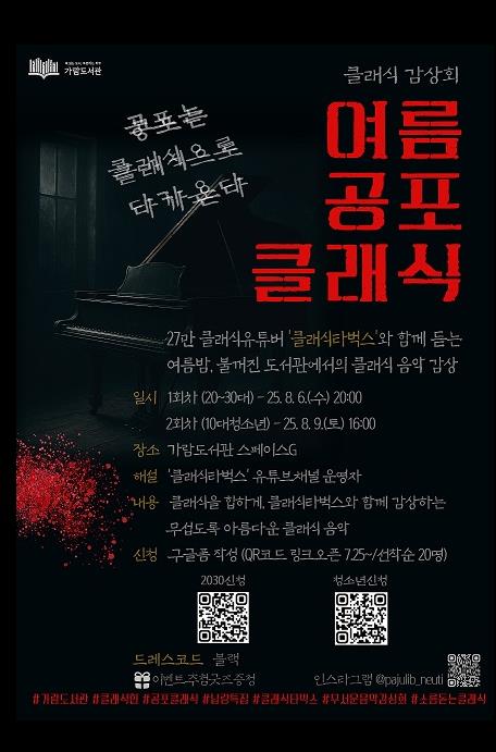 [뉴스노크=김인호 기자] 파주시 가람도서관이 오는 8월 젊은 세대의 감성을 겨냥한 이색 프로그램 ‘여름 공포 클래식 감상회’를 운영한다.