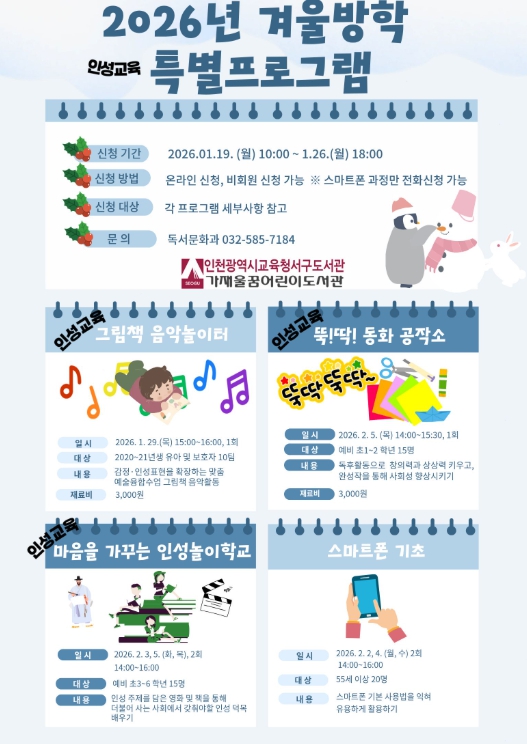 [뉴스노크=김인호 기자] 인천광역시교육청서구도서관은 ‘2026년 겨울방학 특별프로그램’ 학습자를 19일 오전 10시부터 선착순으로 모집한다.