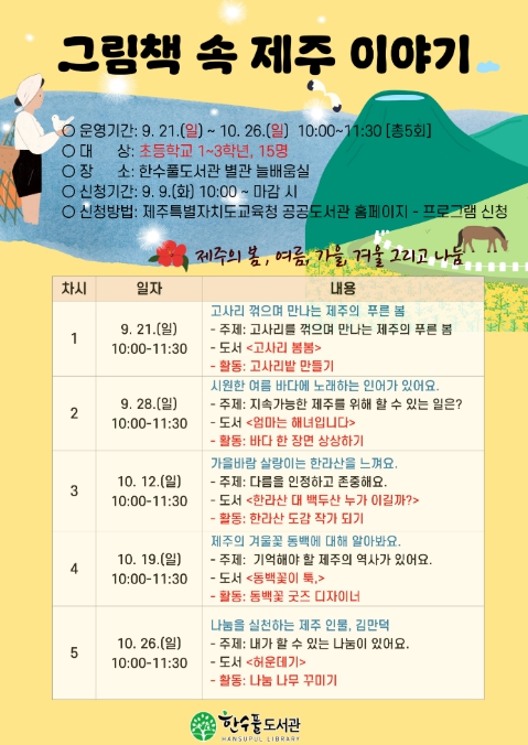 이번 프로그램은 총 5회차로 매주 오전 10시부터 11시 30분까지 진행되며 ‘제주의 봄, 여름, 가을, 겨울 그리고 나눔’을 주제로 어린이들이 그림책을 통해 제주의 자연·환경·문화를 자연스럽게 배울 수 있도록 구성됐다.