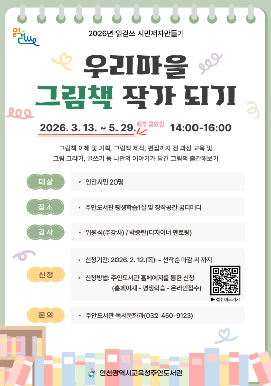 [뉴스노크=김인호 기자] 인천광역시교육청주안도서관은 읽걷쓰 시민저자 양성을 위한 ‘우리마을 그림책 작가 되기’ 프로그램 참여자를 모집한다.