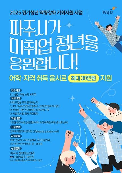 [뉴스노크=김인호 기자] 파주시는 청년들의 취업 준비 비용 부담을 낮추고 고른 취업 기회 제공하기 위해, 미취업 청년에게 어학·자격시험 응시료를 최대 30만 원까지 지원하는 ‘경기청년 역량강화 기회지원’사업의 하반기 접수를 8월 1일 시작한다고 밝혔다.