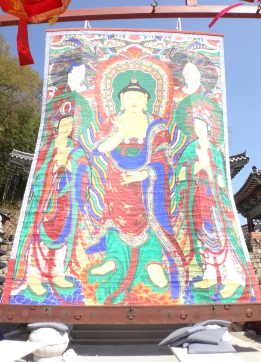 괘불도는 호국사에서 큰 법회 시 야외에 걸어서 사용하는 것으로서 화면 중앙에 부처를 중심으로 협시보살과 가섭·아난존자 등 오존(五尊)으로 간략하게 구성된 영산회상도 형식의 불화로 면포(綿布) 위에 채색했으며 상단의 중앙과 좌우에 비단으로 만들어진 복장낭이 걸려있다.
