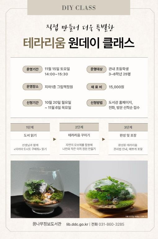 [뉴스노크=김인호 기자] 동두천시 도서문화사업소 꿈나무정보도서관은 오는 10월 20일부터 초등학교 3~6학년을 대상으로 『테라리움 만들기』 원데이 클래스를 운영한다고 밝혔다.