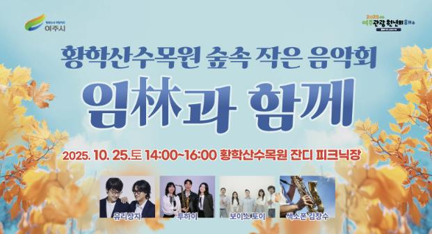 [뉴스노크=김인호 기자] 여주시는 오는 10월 25일 오후 2시부터 4시까지 황학산수목원 잔디피크닉장에서 ‘임(林)과 함께’ 음악회를 연다고 밝혔다.