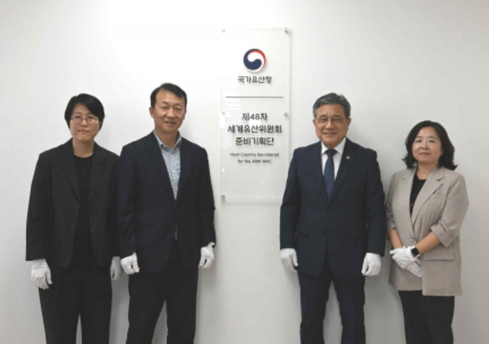 | ▲ 제48차 유네스코 세계유산위원회 회의 준비기획단 현판식(10월 15일 왼쪽부터 여성희 준비기획단 부단장, 최보근 국가유산청 차장, 허민 국가유산청장, 이은복 준비기획단장) |